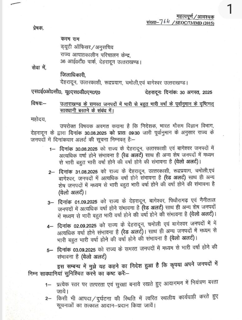 आपदा प्रबंधन विभाग ने सभी जिलाधिकारियों को अलर्ट मोड में रहने के निर्देश दिए हैं। साथ ही लोगों से अपील की गई है कि भारी बारिश के दौरान अनावश्यक यात्रा न करें और नदियों-नालों के किनारे जाने से बचें। प्रशासन ने साफ किया है कि पहाड़ों में भूस्खलन और मैदानी क्षेत्रों में जलभराव की स्थिति किसी भी समय उत्पन्न हो सकती है, इसलिए सतर्कता ही सबसे बड़ा बचाव है।